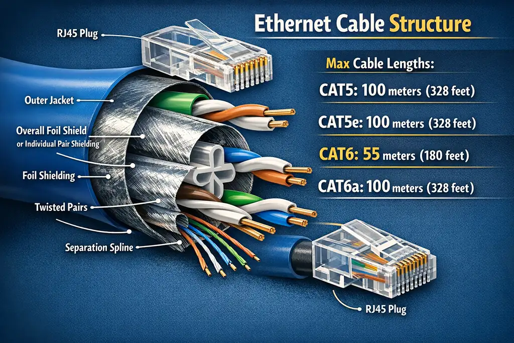 CAT5- ja CAT5e-kaapeleiden enimmäispituus on 100 metriä (328 jalkaa). CAT6-kaapeleiden enimmäispituus on 55 metriä (180 jalkaa) 10 Gbps:n nopeudella, kun taas 1 Gbps:n nopeudella se voi olla jopa 100 metriä. CAT6a tukee 10 Gbps:n nopeutta 100 metrin (328 jalan) etäisyydellä. Kaapelin laadusta riippuen nämä kaapelit voivat toimia myös pidemmillä etäisyyksillä, mutta luetellut arvot edustavat perusominaisuuksia.