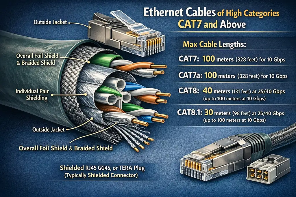 Suurin tuettu kaapelin pituus. CAT7- ja CAT7a-kaapelit tukevat jopa 10 Gbps:n tiedonsiirtonopeuksia standardin mukaisella 100 metrin Ethernet-etäisyydellä. CAT8-kaapelit on suunniteltu ensisijaisesti datakeskuksiin, ja ne tukevat 25 tai 40 Gbps:n nopeuksia lyhyemmillä etäisyyksillä, tyypillisesti enintään 30–40 metrin etäisyydellä, säilyttäen samalla kyvyn siirtää dataa 10 Gbps:n nopeudella pidemmillä etäisyyksillä.