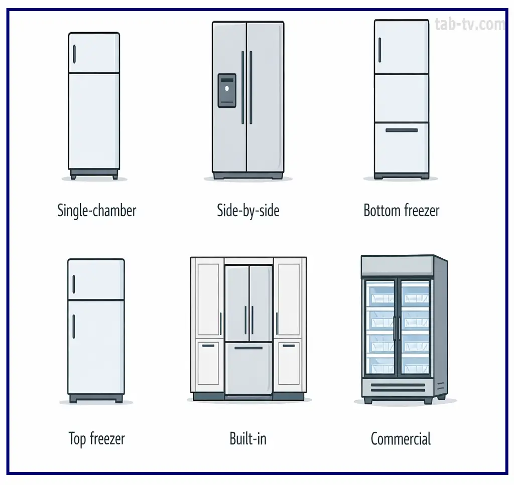 Yksiosastoiset mallit ovat kompakteja ja niissä on pieni pakastinosa. Side-by-side-malleissa jääkaappi ja pakastin on sijoitettu vierekkäin pystysuunnassa, ne tarjoavat suuren kapasiteetin ja sisältävät vesi- ja jääannostelijat. Käytännöllisempi ratkaisu on jääkaappi, jossa pakastin on alhaalla ja pääosasto silmien korkeudella. Yläpakastimella varustetut mallit ovat klassinen vaihtoehto, mutta tätä rakennetta pidetään nykyään vanhentuneena, vaikka tällaisia jääkaappeja valmistetaan edelleen. Kalusteisiin integroitavat jääkaapit asennetaan keittiökaappeihin; ne ovat melko yleisiä, ja joillakin valmistajilla, kuten Samsungilla, on kokonaisia tuotelinjaa tällaisista laitteista.