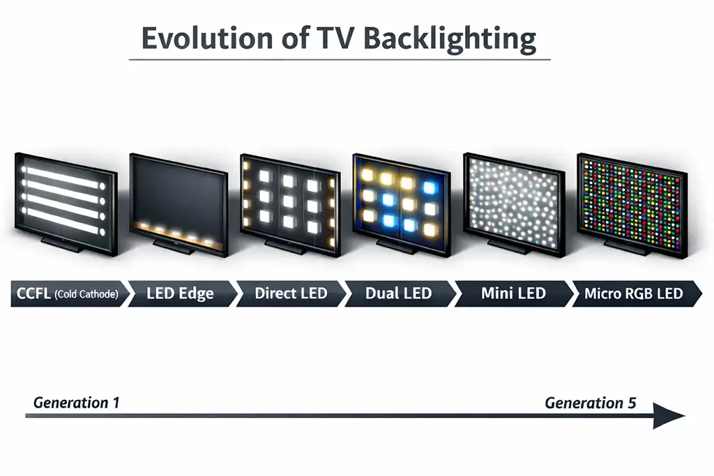 Micro LED -taustavalo on seurausta televisioiden taustavaloteknologioiden jatkuvasta kehityksestä, ja sitä voidaan pitää tämän kehityksen viidentenä vaiheena. Ensimmäinen sukupolvi käytti kylmäkatodiloistelamppuja (CCFL). Tätä seurasi LED Edge -taustavalo, sitten Direct LED. Myöhemmin ilmestyivät Dual LED -järjestelmät, joissa taustavaloon lisättiin sininen LED. Seuraava askel oli Mini LED -teknologia, jossa suuremmat LEDit korvattiin pienemmillä, mikä lisäsi valonlähteiden määrää ja paransi kirkkauden hallintaa. Micro LED -taustavalo on tämän kehityksen seuraava vaihe ja käyttää kolmea erillistä LEDiä — punaista, vihreää ja sinistä.