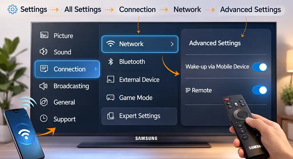 Aktivoidaksesi „Wake via Mobile Device” -toiminnon siirry kohtaan „Asetukset” → „Kaikki asetukset” → „Yhteys” → „Verkko” → „Lisäasetukset” ja ota tämä vaihtoehto käyttöön. „IP Remote” -toiminto otetaan käyttöön samasta valikosta.
