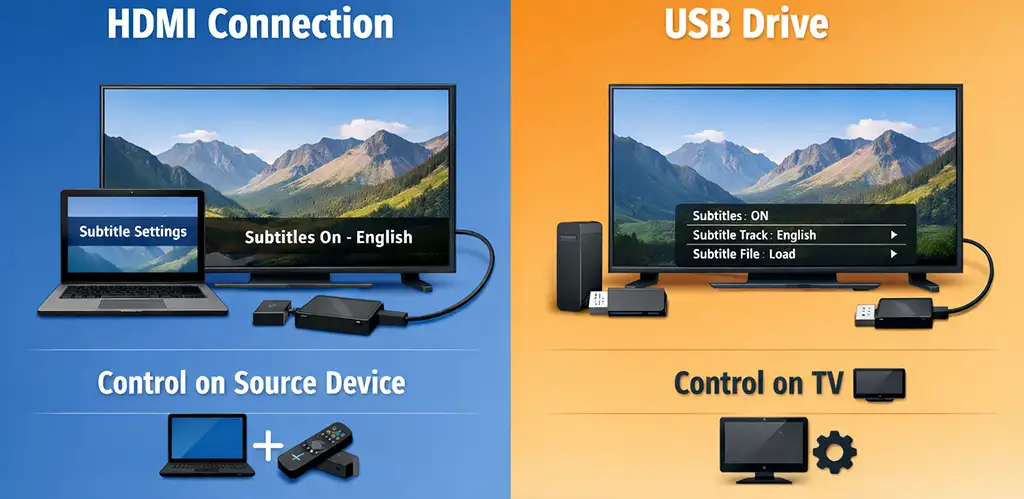 HDMI-yhteyden kautta televisio vastaanottaa valmiin videosignaalin, jossa tekstitykset ovat jo mukana. Toisin sanoen televisio toimii käytännössä näyttönä. Tämä tarkoittaa, että kaikki asetukset — tekstitysten päälle- tai poiskytkentä, kielen valinta tai esitystavan määritys — tehdään lähdelaitteessa, kuten kannettavassa tietokoneessa tai suoratoistolaitteessa, kuten Amazon Fire TV Stickissä.